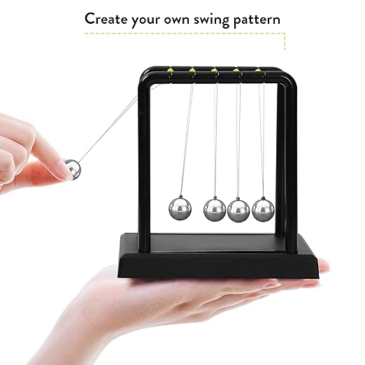 FUN PLAY: When sphere is lifted and released at one end, the sphere at the other end lifts upward due to the force that has been transmitted through the stationery spheres. The last sphere which was lifted upwards now drops and force is transmitted through the remaining stationery spheres and repeating in the opposite direction