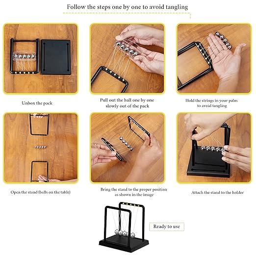 NOBLE DESIGN: Shining arch cradle frame made of High quality PP material, Stainless metal balls hanging on durable Nylon strings, and Vintage plastic base, can be put on your desk, shelf and more. Note: Pendulum may tangle if you operate wrongly. Kindly handle with care while unpacking