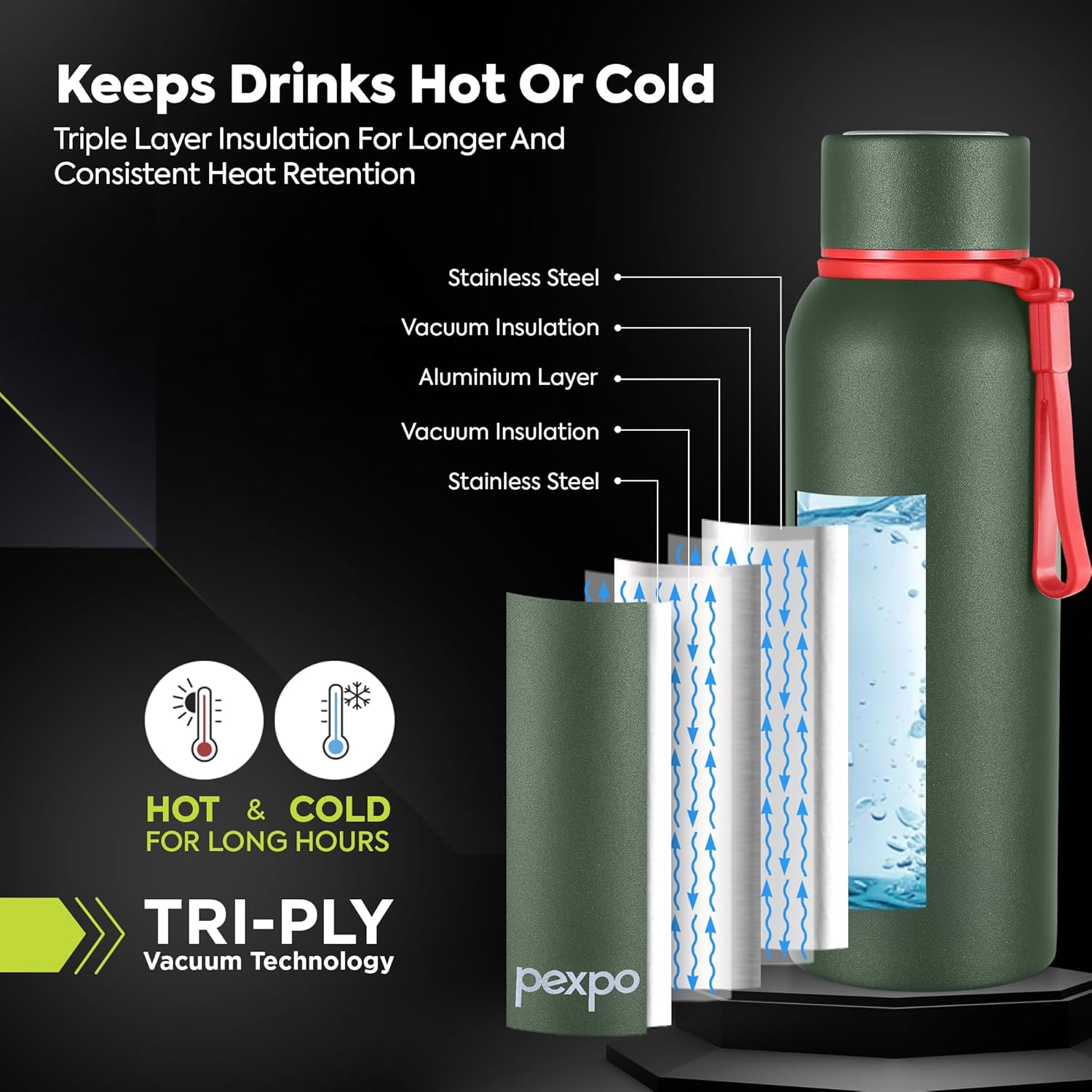 ADVANCED TRI-PLY VACUUM TECHNOLOGY: Unlike Double Wall, this water bottle comes with three layers of insulation, which keeps your beverages hot or cold for hours which keeps the retention of temperature same for a longer duration